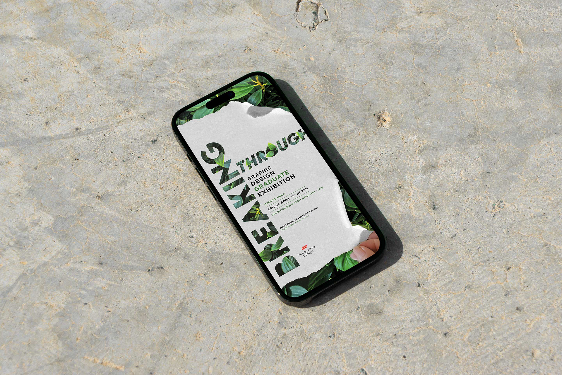 In Photoshop, I layered these photographs over a white paper background and added a peeling corner for a 3D effect. As the paper lifts, more foliage is revealed, emphasizing the concept of breaking through barriers and growing beyond them. Every detail, from textured shadows to event information, was carefully designed to guide the viewer’s eye from the bold title to the essential details.